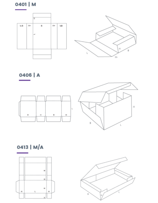 04-折叠型纸箱 通常由一页纸板经压痕、模切而成型,不需钉合与粘合。 适合大批量食品类、饮料类、PIZZA等包装居多。