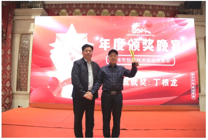 凭借过硬的产品品质、齐全的解决方案和优秀的服务能力,上海鼎龙机械有限公司持续引领纸箱机械发展,在业内享受盛誉。年会晚宴上,上海包协纸委会为上海鼎龙机械有限公司创始人及董事长丁根龙先生颁发“终身成就奖”,以表彰其数十年对行业的卓越贡献。