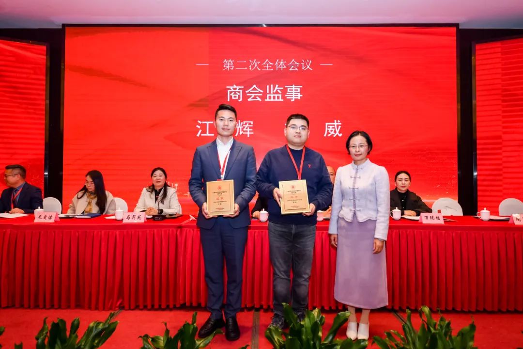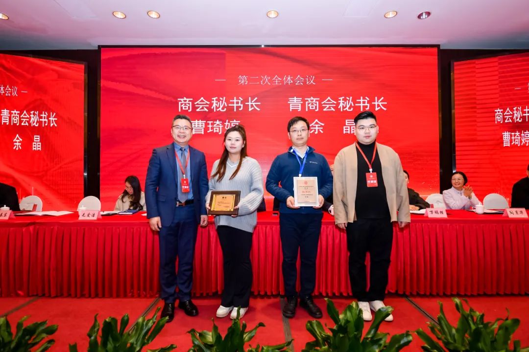 南桥镇第三届青年商会常务副会长万亿兆为青商会秘书长余晶颁发聘书;南桥镇第六届商会会长周春东为商会秘书长曹琦婷颁发聘书。